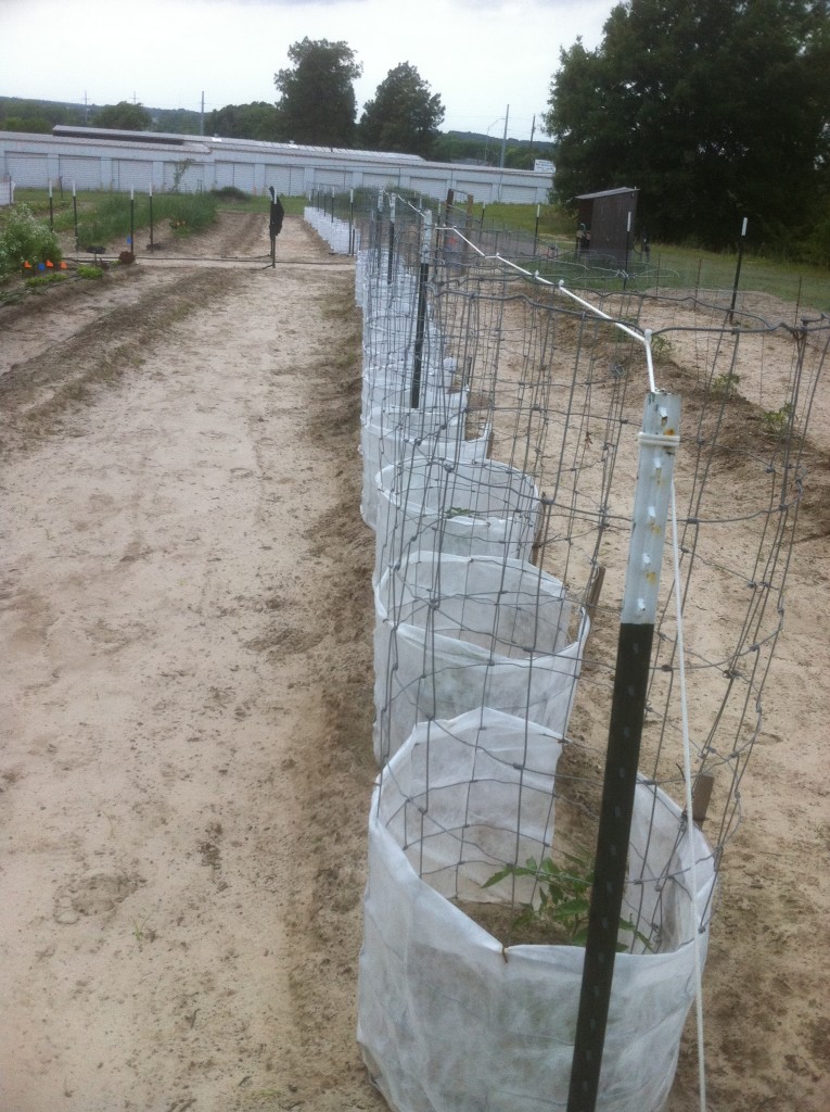 Tomatoes still protected from the cold.